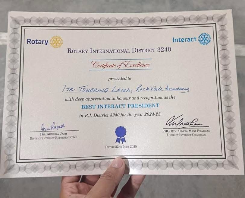Itr Tshering Lama of the Interact Club of Rockvale Academy has been awarded the Best Interact President for the Rota Year ’24-’25 in RI District