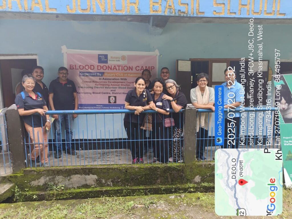 On Sunday, July 20, 2025, the Rotary Club of Kalimpong hosted a successful camp at Mani Memorial Primary School in Sindebong. The event aimed to achieve three main objectives: facilitating a Blood Donation Camp, supporting the Animal Resource Development Department’s efforts with the Kalimpong Animal Shelter, and promoting the services of the Kalimpong District Volunteer Blood Donors Forum and Kalimpong Blood Centre at the District Hospital.